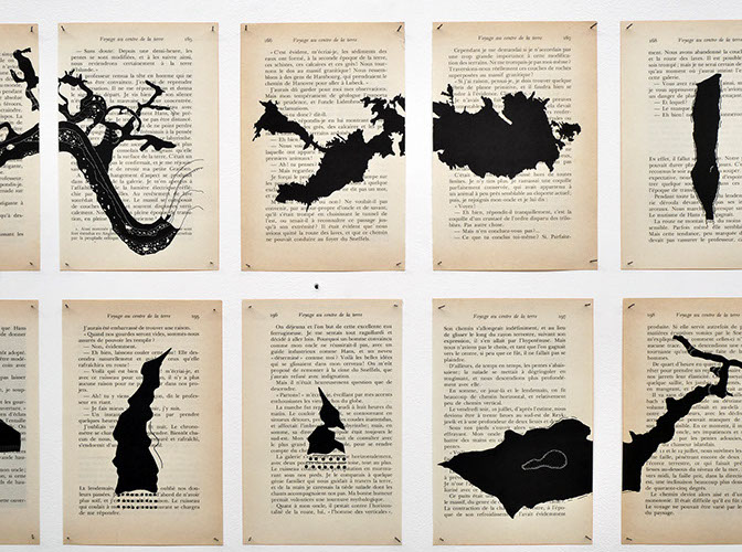 Des cartes topographiques de grottes ornées de peintures et de gravures imprimées sur les pages du Voyage au centre de la Terre de Jules Verne. L’Histoire dans l’histoire. Les cartes révèlent également des formes et des lignes relatives à la géologie des lieux, résonance naturelle aux signes géométriques retrouvés dans les grottes préhistoriques, de la Dordogne à l’Australie.