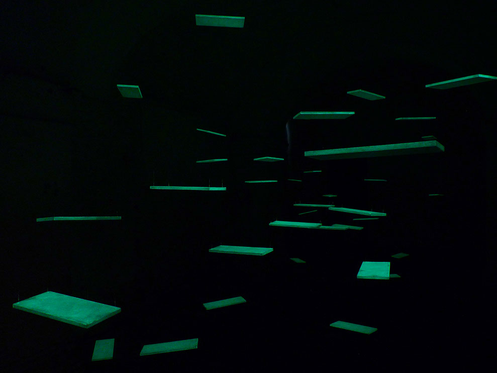 L'installation conçue en deux temporalités, jour / nuit, se calque sur une temporalité classique. L'éveil, le sommeil. Lequel est le moins réel? La confusion des rêves. Les absences flottantes, c'est d'abord un rêve dans lequel je rêve de Giulia Camassade, flottant dans les décombres d'une forêt.