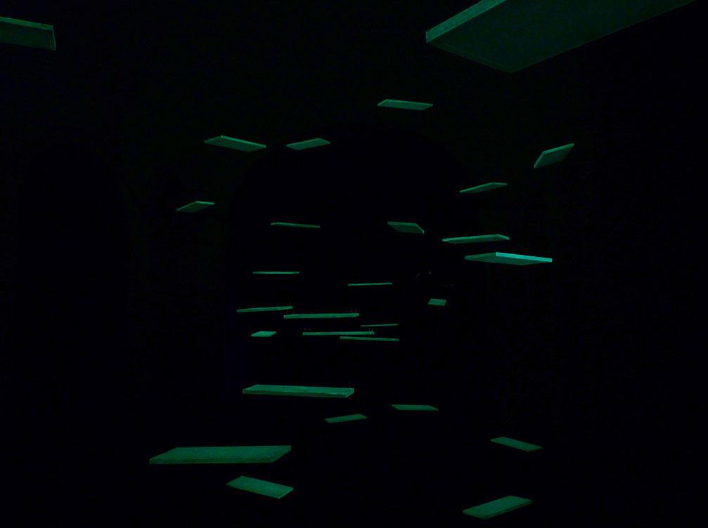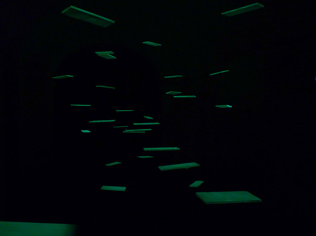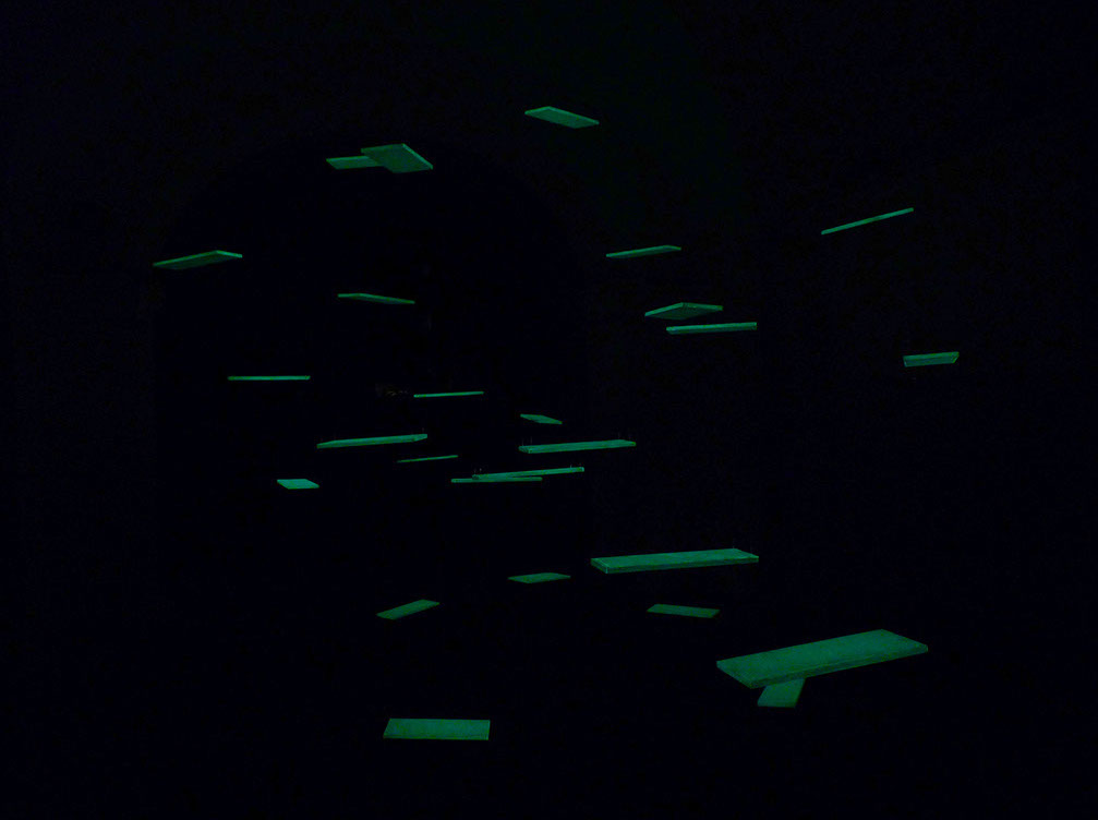 Balançoires, boirs, fil de nylon, ampoule, rideau, vernis phosophorescent, acrylique