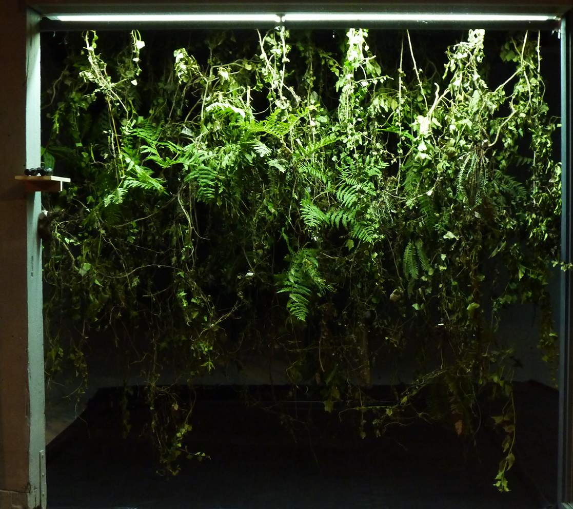 Végétaux, branches, jumelles, calcaire, basalte, ficelle, ampoule, lumière noire, eau, bâche plastique, ventilateur