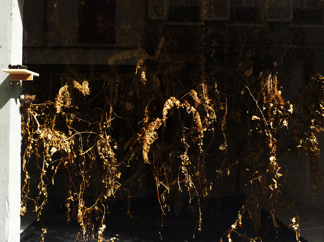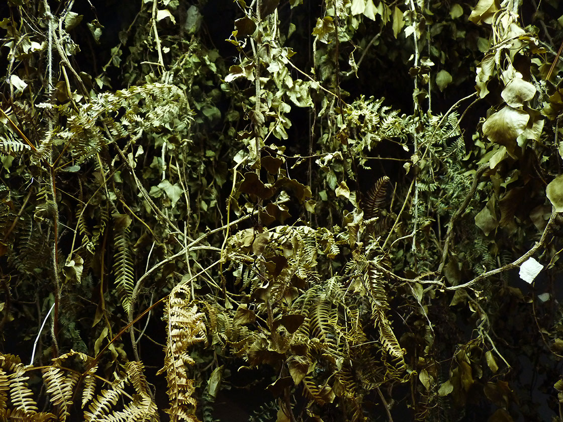 L'œuvre s'est ainsi décomposée sous l'effet de serre de la vitrine et l'assèchement des végétaux.